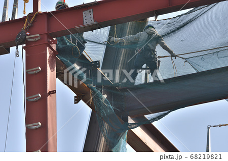 新築倉庫の鉄骨組み立て とび職人の落下防止ネット取り付け作業風景の写真素材 6191